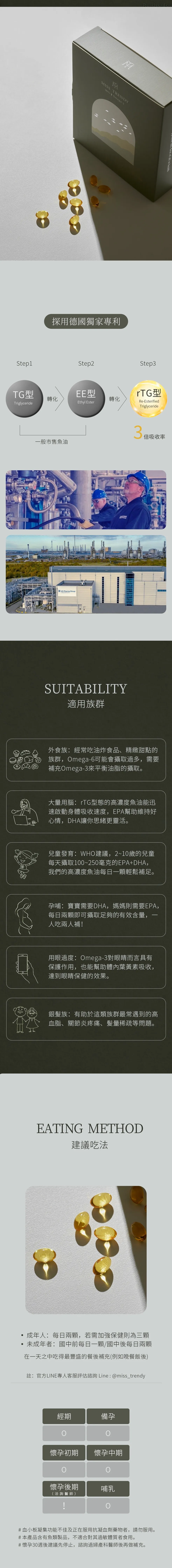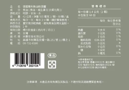 . 60粒/盒 . 與德國KD Pharma大廠合作生產 . Omega 3 脂肪酸高達92%以上 . EPA+DHA高達80%以上 每份EPA550mg/DHA250mg . 採用吸收率最高的rTG型式魚油 . 原料獲得21項國際專利 . 超臨界萃取 / 深海無污染小魚 / 無腥味 食品業登錄字號:E-183584000-00001-1